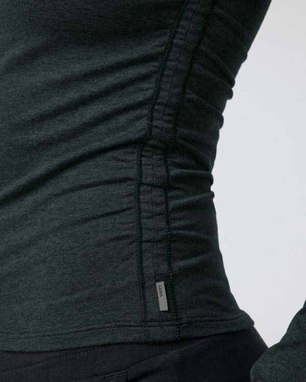 Subtle side ruching gives figure-hugging shape to this long-sleeve tee. Built with our DreamKnit fabric made from 89% recycled materials. this crewneck top breathes easy and wicks away moisture for a more comfortable sweat session.