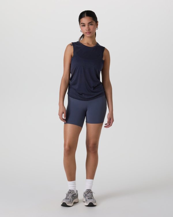 Our women’s The Rise The Shine Tank in Midnight features a sun and mountain graphic on the front with a muscle-tank fit. Shop now from Vuori.
